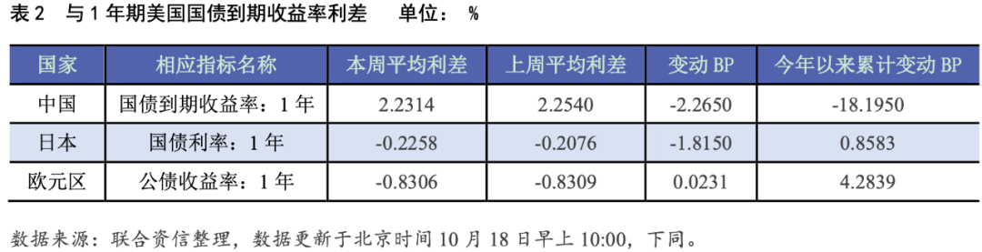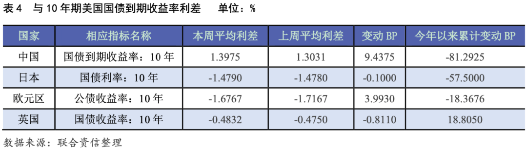 本周各期限中美國債平均收益率利差走勢不一,1年期中美國債平均收益率利差較上周收窄2.27個BP至2.23%;5年期和10年期中美國債平均收益率利差分別較上周走擴2.47個和9.44個BP至1.72%和1.40%。本周1年期、5年期和10年期日美國債平均收益率利差分別較上周走擴1.82個、8.11個和0.10個BP至-0.23%、-1.16%和-1.48%。本周1年期和10年期歐元區公債與相應期限美債平均收益率利差分別較上周收窄0.02個和3.99個BP至-0.83%、-1.68%;5年期歐元區公債與相應期限美債平均收益率利差較上周走擴2.29個BP至-1.58%。本周5年期和10年英美國債平均收益率利差分別較上周收走擴2.62個和0.81個BP至-0.34%和-0.48%。
