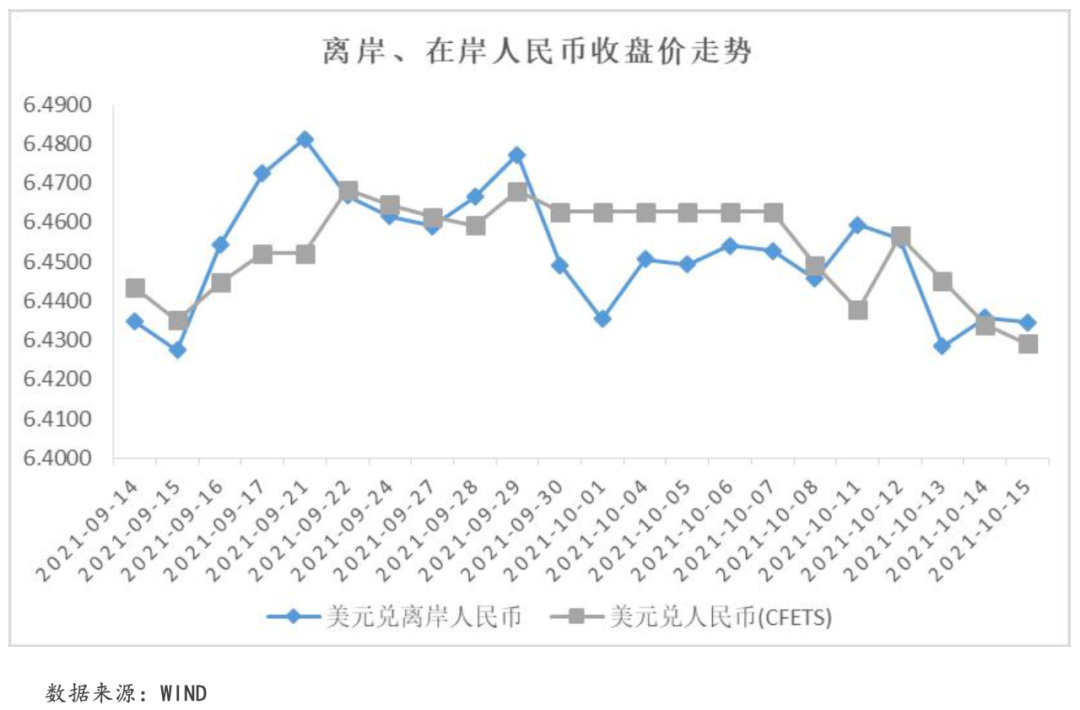 本周,在美元指數走弱的背景下,離、在岸人民幣匯率均小幅升值。截至周五,美元兌離岸人民幣匯率收于6.4345,周內累計收跌0.16%;美元兌在岸人民幣匯率收于6.4291,周內累計收跌0.20%。