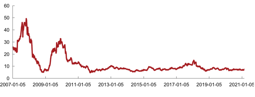 克而瑞內(nèi)房股領(lǐng)先指數(shù)成分股相對(duì)香港地產(chǎn)股大樣本整體PE 2021年2 月進(jìn)一步回升。2月該相對(duì)PE周均值為-1.8%,高于上周均值-4.7%,低于2020年周均值-1.5%。香港地產(chǎn)股大樣本2月整體PE周均值為7.27,低于上月周均值7.32,低于2020年至今周均值7.42。