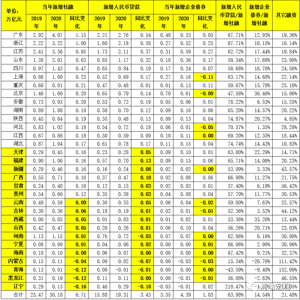 (一)實際上2021年4月1日的新聞發布會上央行便表示“已經注意到了關于區域信貸投放平衡的問題”。而從數據上看2020年全年新增社融與新增信貸投放分別高達34.86萬億和18.89萬億(較2019年分別多增9.29萬億和2.01萬億),但主要集中在廣東、浙江、江蘇、山東、四川、上海、重慶、北京、安徽等地區,而諸如遼寧、黑龍江、青海、內蒙古、海南、寧夏、河南、山西、西藏、吉林、云南等地區實際上并沒有獲得較多的融資支持(主要以東三省、西北地區以及中部地區的省份為主)。