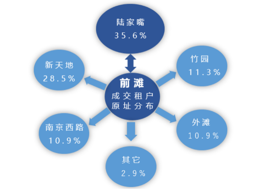 前灘商務區(qū)在2020年表現(xiàn)亮眼,不僅局限于新設企業(yè)租戶,對其他傳統(tǒng)商務區(qū)的吸附效應也較為明顯,全年上海大面積(≥8000㎡)成交租戶中,前灘商務區(qū)占比近一半。