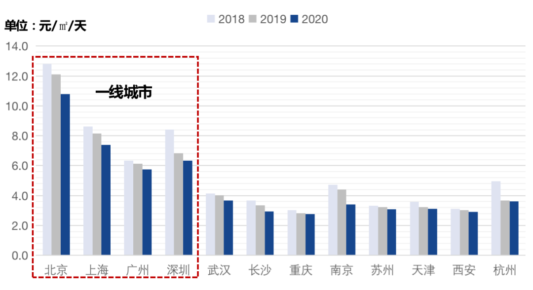 1、租金近三年持續(xù)下降,一二線城市坪效差距大