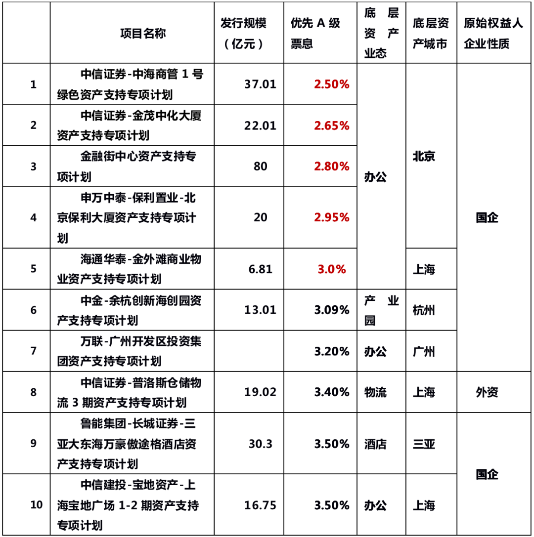 在“靈活穩(wěn)健”的貨幣政策總基調下,央行多次釋放流動性呵護市場。疫情背景下,機構的投資策略則趨于保守,大量資金涌向國企一線城市核心地段優(yōu)質辦公資產(chǎn)ABS產(chǎn)品。按ABS優(yōu)先A級產(chǎn)品發(fā)行票息由低到高排行,發(fā)行票息最低的前5位均為一線城市核心地段國企辦公資產(chǎn),發(fā)行利率均不高于3%。而在發(fā)行票息最低的TOP10存量資產(chǎn)ABS產(chǎn)品中,辦公資產(chǎn)占據(jù)了7席,均為一線城市核心區(qū)域優(yōu)質辦公資產(chǎn),發(fā)行主體方面,國企更是占據(jù)9席,“優(yōu)質主體“+“優(yōu)質資產(chǎn)”的雙保險成為市場資金的“最優(yōu)選擇”。