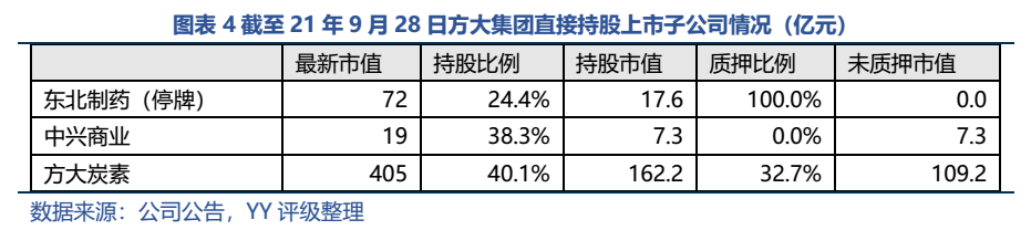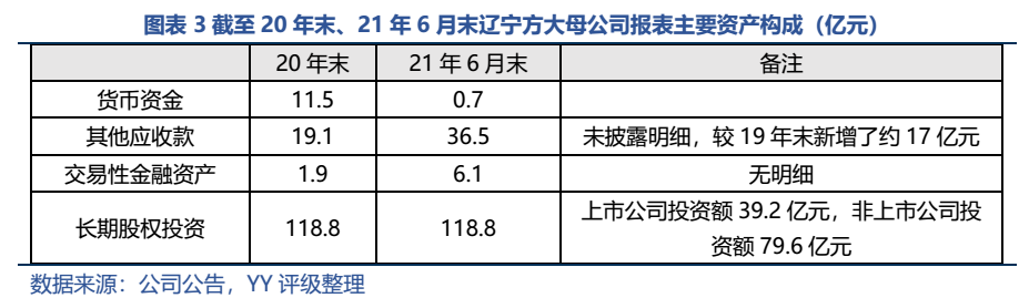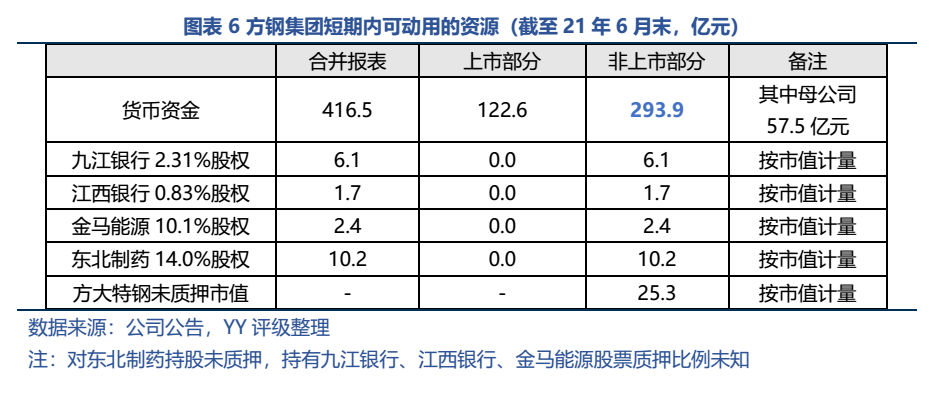 非上市公司部分,截至20年末投資明細(xì)如下(估計(jì)21年上半年未發(fā)生變化)。方鋼集團(tuán)(上市公司方大特鋼的母公司)為發(fā)債企業(yè),截至21年6月末其賬面歸母凈資產(chǎn)218億元,方大集團(tuán)對(duì)其100%持股,母公司報(bào)表采用歷史成本法僅計(jì)入投資額21.4億元,若處置部分股權(quán)能釋放不少資金。其他公司透明度較低,且作為非上市公司,預(yù)計(jì)短期內(nèi)處置變現(xiàn)的難度也較大。