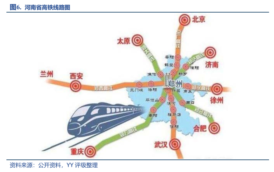 河南鐵路通車里程居全國第一,三橫五縱的鐵路網絡在此交匯,而鄭州作為京廣、隴海線的交匯點,素有中國鐵路心臟之稱,因此河南的高鐵建設基本也是以鄭州為核心,延省內各市鋪展而開,整體呈現米字型,有“橫”貫東西的徐蘭高鐵,“豎”連南北的京廣高鐵,“撇”望中原的鄭萬高鐵,“捺”指江南的鄭合高鐵,以及“點”通西北的鄭太、鄭濟(尚未開通)高鐵。另外中歐班列(鄭州)輻射30多個國家130多個城市,加大了開放的力度。