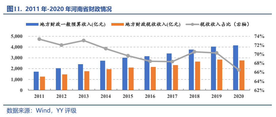 財政上看,2020年河南省一般公共預算收入4,155.20億元,增長2.80%;稅收收入2,764.66億元,下降2.70%,占一般公共預算收入的比重為66.50%。