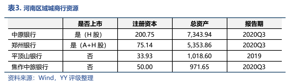 從金融實力上來看,河南的金融業不算發達,對河南信用債市場的托底作用并不明顯。截至2020年末,各項存款余額為76,446.19億元。區域銀行資源上,除了在調研過程中,發行人領導們均提到的鄭東新區已集齊12家股份制銀行之外,河南還擁有中原銀行、鄭州銀行、平頂山銀行和焦作中旅銀行四家城商行,其中中原銀行和鄭州銀行兩家上市銀行的資產規模過五千億;農商行規模基本上在500億以下。