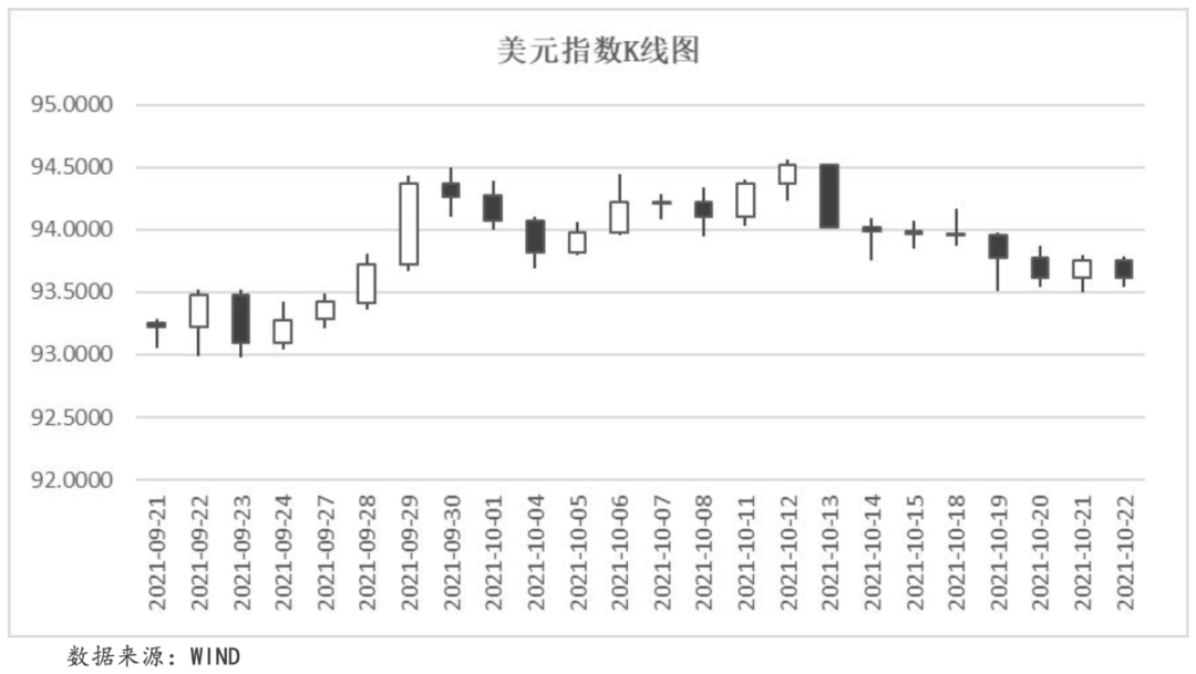 本周,美元指數出現下跌。一方面,美國“褐皮書”顯示經濟增速已呈現放緩的狀態,打壓美元走勢;另一方面,隨著美國PMI制造業數據的釋出顯示美國勞動力和供應鏈的問題仍將繼續限制制造業的恢復,市場對美國經濟的復蘇預期受到打壓。截至本周五,美元指數收于93.6116,周內累計收跌0.38%。
