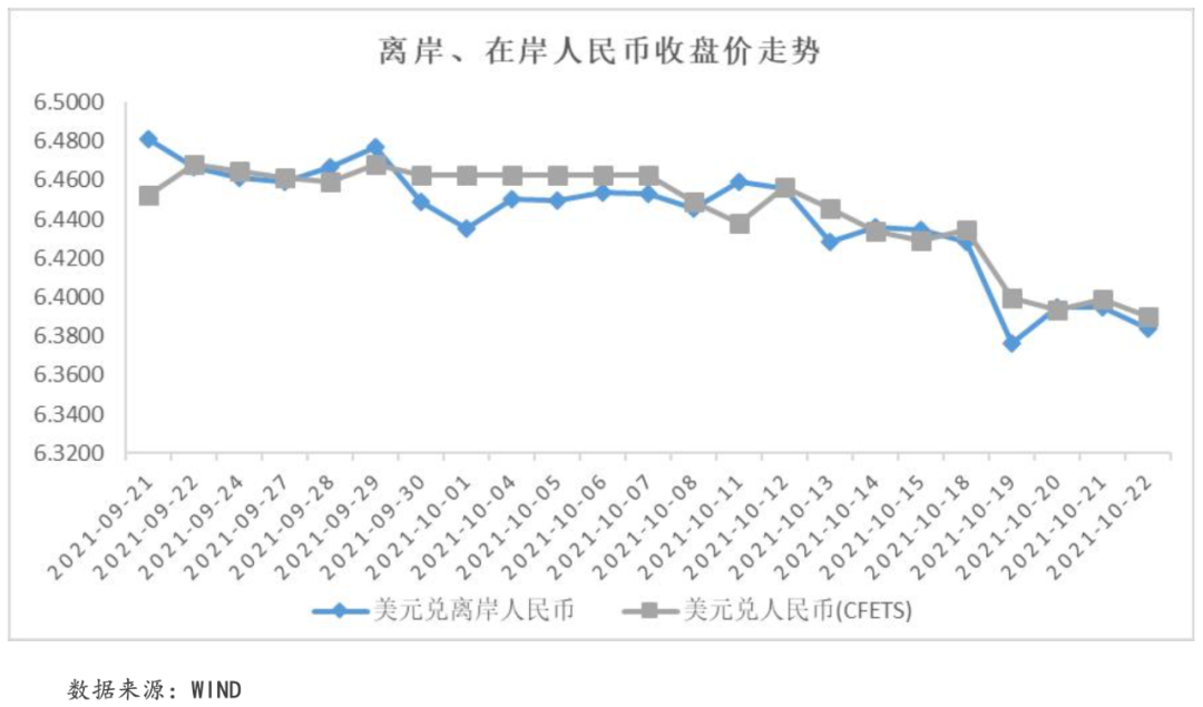本周,中國三季度GDP增幅同比達4.9%,經濟復蘇持續穩定向好;而美國通脹問題持續,經濟恢復不確定性增加。因此,在岸和離岸人民幣匯率均呈現波動走強態勢。截至周五,美元兌離岸人民幣匯率收于6.3839,周內小幅下跌0.79%;美元兌在岸人民幣匯率收于6.3903,周內累計收跌0.66%。