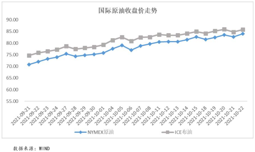 本周,國際油價繼續周內全面上漲。一是隨著全球經濟復蘇步伐的加快,石油需求顯著上升,如10月美國和歐元區PMI制造業和服務業活動指數仍然高于50,經濟活動仍在擴張;二是隨著亞洲市場對石油需求的上升(韓國11月原油購買量創下歷史最高水平),當下的石油供給結構將進一步緊張。三是各國能源儲備逐漸下降的基礎上,OPEC+仍保持原計劃產出,供應趨緊。總體來看,在供應不足的條件下,強勁的需求拉動石油價格上揚。截至本周五收盤,NYMEX原油價格收于83.98美元/桶,周內累計收漲2.41%;ICE布油價格收于85.77美元/桶,周內累計收漲0.97%。