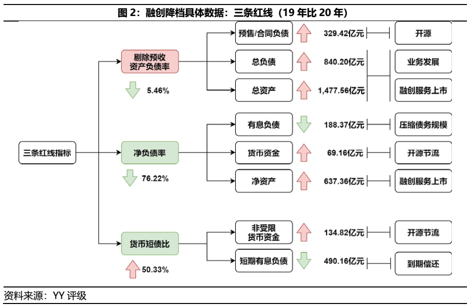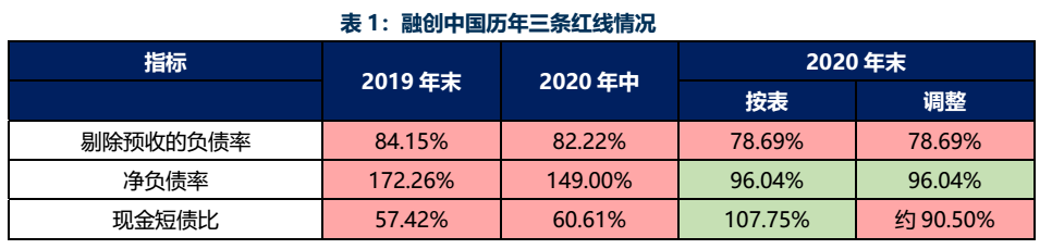 自19至20年之間,融創(chuàng)的三道紅線指標均有改善,除了依賴于融創(chuàng)服務上市外,加速去化并減少拿地亦是公司降杠桿的主力。順帶一提,從圖2也可看出,剔除資產(chǎn)負債率屬于三個指標最不易調(diào)整的指標,該指標體現(xiàn)了公司整體業(yè)務布局的激進程度(杠桿程度)。只要公司仍然利用杠桿進行擴張拿地,自黃檔晉升為綠檔的可能性仍較低,并不是單單利用加快去化得以調(diào)節(jié)的。