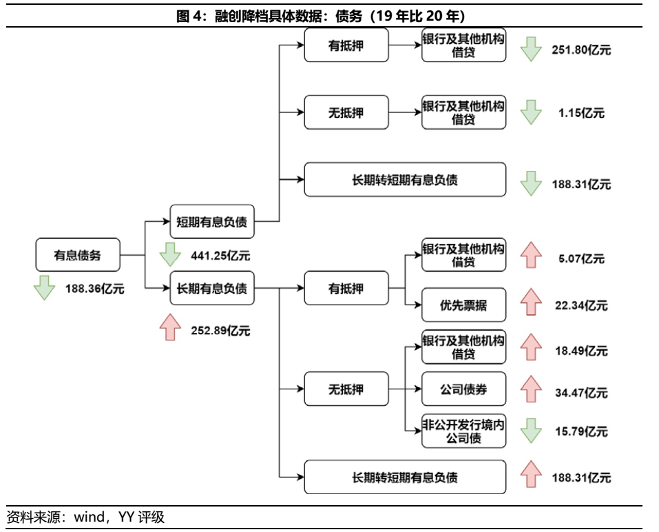 此外,根據(jù)債務梳理結果發(fā)現(xiàn),融創(chuàng)的短期債券并沒有進行即期/非即期的細部梳理,若經(jīng)由對債券兌付期限進行調(diào)整分類,則經(jīng)調(diào)整所增加的短期債務或導致融創(chuàng)2020年末的檔次轉為橙檔。