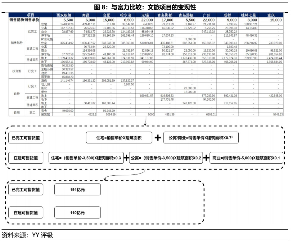 如圖8,將停車位視為0價值,并對相關物業(yè)去化速度進行系數(shù)折算(完工公寓/商業(yè)項目給予0.7折算;在建項目以住宅0.3、公寓0.2和商業(yè)0.1計算;住宅/公寓建筑成本為3,500元/平、商業(yè)業(yè)態(tài)為5,000元/平),13個項目短期內(nèi)的已完工+在建項目可售貨值幾乎為300億元,提供融創(chuàng)后續(xù)運營建設重資產(chǎn)文旅業(yè)態(tài)有效支持,從而使融創(chuàng)與富力拉開差距。