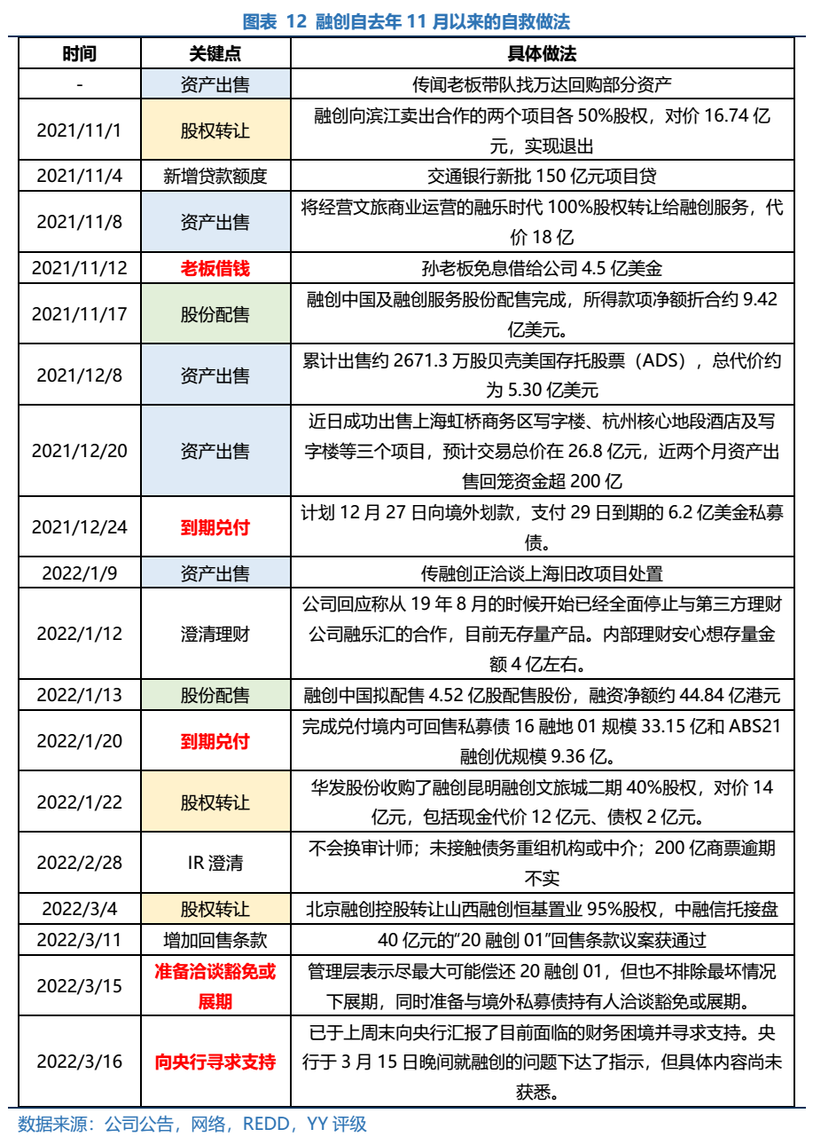 04 研判其努力程度:融創較早就開始了各種渠道的自救,稱得上努力。在行業多重利空打壓、外評接連下調下,公司的自救行為絕大程度體現了實控人孫老板個人較強的償債意愿。雖偶有傳出商票逾期,但整體看公司通過多次配股、股權轉讓、資產處置以及老板無息借款等方法提供流動性,相比多數已展期或“躺平”的民企來說,已算盡力。