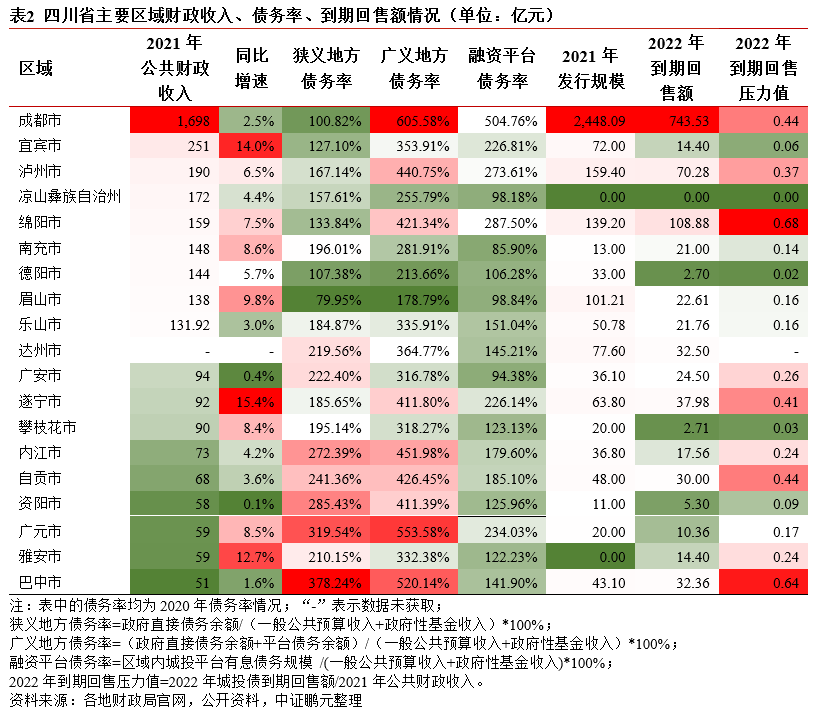 成都到期回售規模以及存量規模均較大,但鑒于較好的融資環境,到期回售壓力可控;綿陽、瀘州到期回售規模較大,存在一定的到期回售壓力