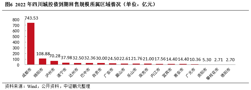 (2)2022年成都的到期回售城投債規模遙遙領先,其次是綿陽、瀘州,兩地存在一定的到期回售壓力。2022年成都市城投債到期回售金額遙遙領先,其占四川省到期回售城投債總額的51.10%。綿陽、瀘州到期回售規模較大,分別為108.88億元、70.28億元,存在一定的到期回售壓力。