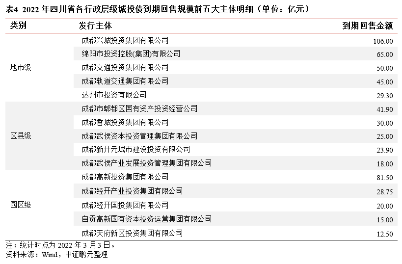 地市級平臺到期回售情況以成都、綿陽、瀘州為主,成都的區縣級平臺到期回售規模較為突出,園區級平臺到期回售主要分布在成都、遂寧、自貢