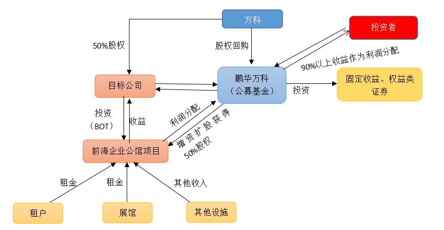 在一定意義上,前海萬科REITs是首只公募REITs的嘗試。上市首日,基金交投活躍,成交額超過5000萬元。發(fā)行期間單個投資者的單筆認購門檻為10萬元。產(chǎn)品成立并上市后,在二級市場1萬元即可參與交易。其標(biāo)的資產(chǎn)主要是萬科前海企業(yè)公館未來8年的租金收益權(quán)。投資分為兩部分,其一是投資于目標(biāo)公司,比例不超過基金資產(chǎn)的50%;另一部分將投資于固定收益類資產(chǎn)、權(quán)益類資產(chǎn)等,比例不低于基金資產(chǎn)的50%。其中,對于目標(biāo)公司的投資是通過增資方式持有目標(biāo)公司50%的股權(quán)至2023年7月24日,由此獲取自2015年1月1日起至2023年7月24日期間前海企業(yè)公館項目100%的租金收益權(quán)。