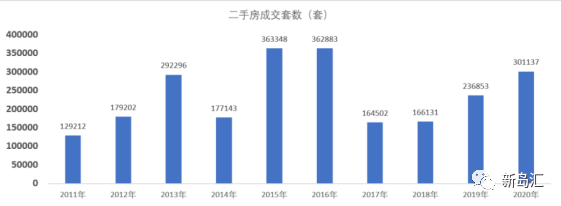雖然2020年并不是二手房成交量最高的一年,但也絕對不低。2017-2019上海二手房的成交套數分別是16.5萬套、16.6萬套、23.7萬套,2020年為30萬套。