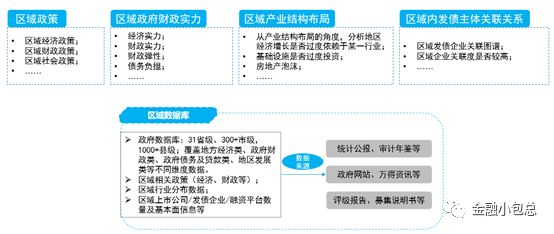 區(qū)域維度看,可以通過整理區(qū)域政策、區(qū)域政府財政實(shí)力情況、區(qū)域產(chǎn)業(yè)結(jié)構(gòu)分布、區(qū)域內(nèi)發(fā)債主體關(guān)系,搭建自己的區(qū)域數(shù)據(jù)庫,如下圖: