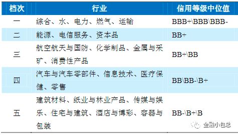 宏觀和行業(yè)維度看,大致可以分為三塊工作。第一是充分借鑒賣方行業(yè)研究的成果。第二是針對行業(yè)信用風(fēng)險,梳理各行業(yè)信用研究的邏輯框架,抓住行業(yè)信用的顯著特性,監(jiān)控每年度行業(yè)信用風(fēng)險的變化,并根據(jù)行業(yè)景氣度確定行業(yè)中長期級別中樞。可參考穆迪、標(biāo)普、惠譽(yù)給予不同行業(yè)敞口不同信用評級中樞的做法,如下圖: