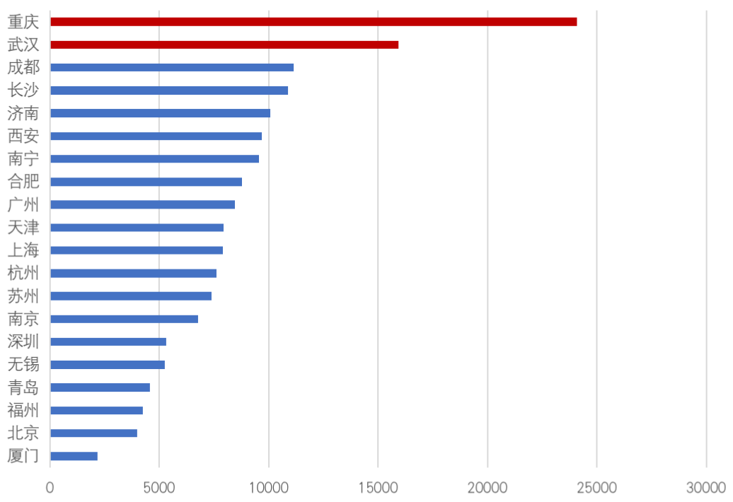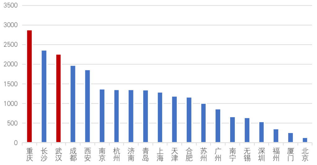 從近一年住宅用地成交規模來看,重慶、長沙、武漢、成都等中西部城市表現依然強勁,重慶成交規模2877萬平方米居首位。隨著項目的建設交付,我們相信,這些項目將在未來一年轉化為該城市企業的重點拓展對象。