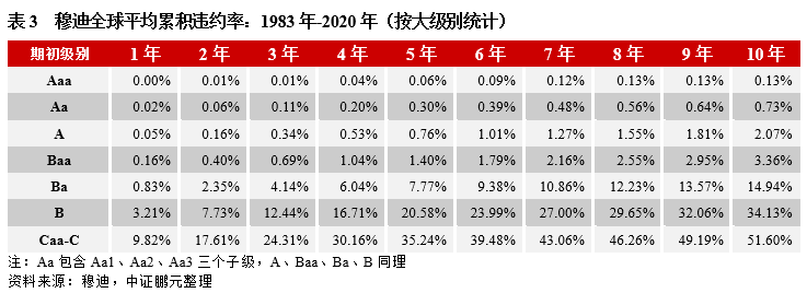 依照上述處理方法,我們按大級別和小級別兩類分別統(tǒng)計了2014-2021年的平均累積違約率,大級別違約率用于觀察違約率從高級別到低級別的整體分布概況,小級別違約率用于觀察子級別間的違約率差異。并對比穆迪全球的平均累積違約率數(shù)據(jù),從而觀察出我國的違約率特征(注:我國數(shù)據(jù)和穆迪全球數(shù)據(jù)的統(tǒng)計年度不完全重疊,兩者經(jīng)歷的經(jīng)濟周期不同,會對違約率產(chǎn)生一定的影響,本文假設這種影響較小,暫且忽略該因素對最終違約率的影響)。