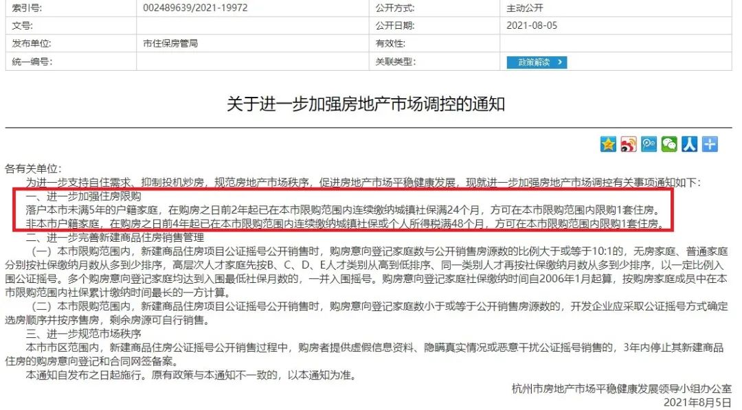 此前大熱的杭州也升級了調控,8月5日一早,杠桿地產就看到大家都在談,杭州《關于進一步加強房地產市場調控的通知》。
