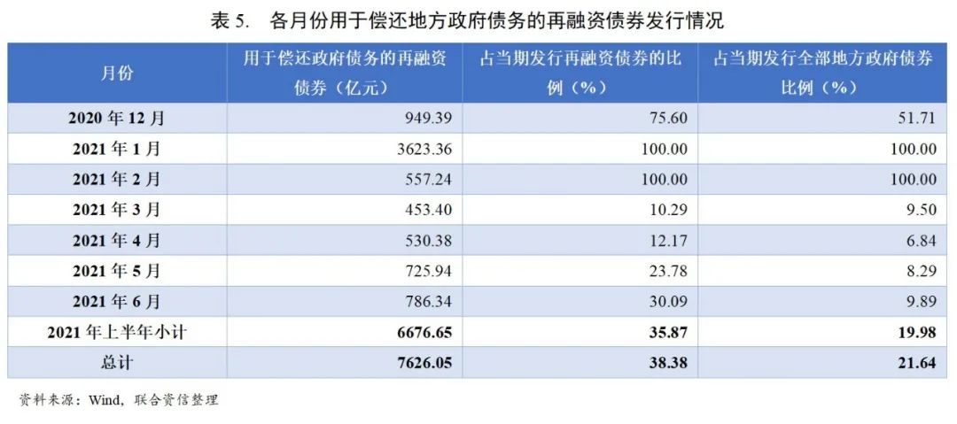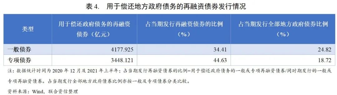 2020年12月及2021年上半年,用于償還政府債務的一般債券和專項債券分別為4177.93億元和3448.12億元,分別占同期發(fā)行再融資債券的比例為34.41%和44.63%,分別占同期發(fā)行全部地方政府債券的比例為24.82%和18.72%。化債用途專項債券在再融資債券中的占比相對較高,或由于地方政府隱性債務的認定通常需要保證債務與公益性項目資產相對應,因此用于項目投資的專項債券或更適合對非債券形式的債務進行置換。