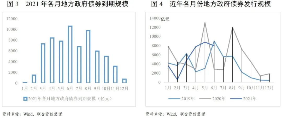 從地方政府債券發(fā)行月份來看,2021年1月為“用于償還地方政府存量債務”再融資債券的集中發(fā)行期間,全月發(fā)行3623.36億元再融資債券,全部用于償還地方政府存量債務,或與當月地方政府債券到期規(guī)模小有關(圖3)。隨后,化債用途再融資債券發(fā)行規(guī)模逐月減少,在當期發(fā)行的再融資債券比例及當期發(fā)行的全部地方政府債券比例亦降低。2021年5月及6月化債用途再融資債券發(fā)行規(guī)模回升,占當期發(fā)行再融資債券的比例也有所回升。根據2019年至今各月份地方政府債券發(fā)行情況看,每年5至9月為地方政府債券發(fā)行高峰(圖4),按現有規(guī)模及比例看,預期2021年下半年仍有較大規(guī)模再融資債券用于緩解地方政府債務壓力。