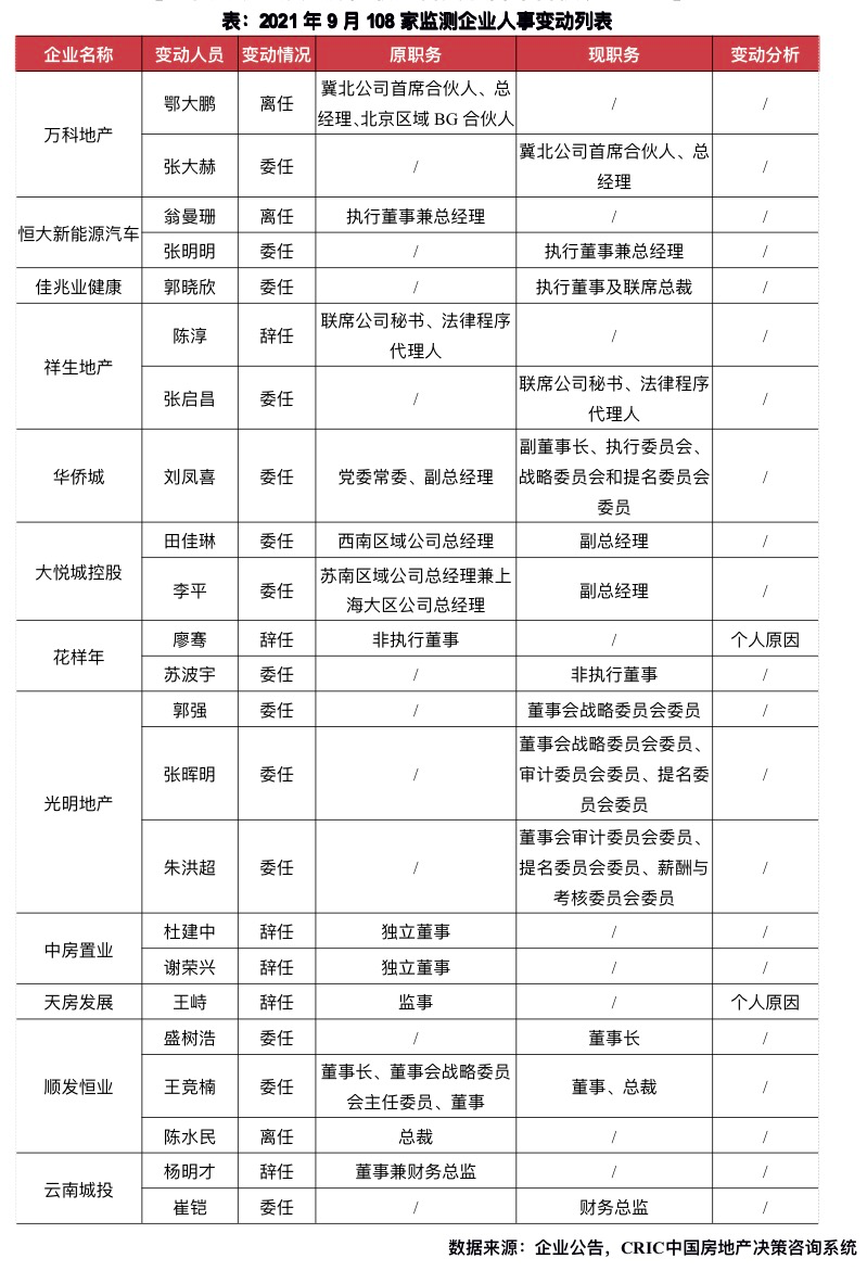 9月,受上月年中業績發布余波的持續影響發酵,房企高層人事動態信息數量較上月明顯上升,從108家監測企業的人事變動情況來看,企業高層變動頻率明顯較前兩月有所提升。