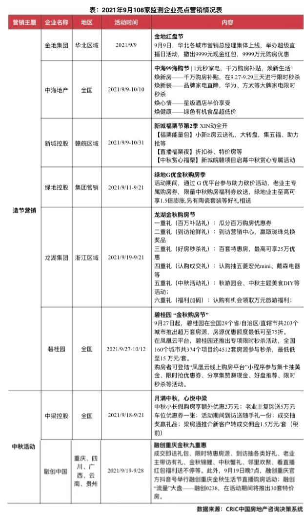 9月營銷方式仍然以造節為主,折扣力度出現松動,主要體現在特價房、工抵房上。從營銷方式來看,本月房企營銷仍然以造節營銷為主,龍湖、碧桂園以節日為名推出“金秋購房節”,中海以日期為名,推出“99海購節”,新城則以企業支持的公益活動為名推出“新城福栗節”。優惠讓利上也比較一致,主要是優惠券和特價房兩種方式。不過需要關注的是,本月桂林和青島出現了扣力度較大的“工抵房”特價房源,惠州也出現了零首付、購房返現等現象,壓力之下企業折扣出現松動。