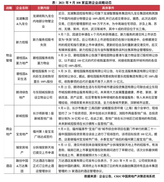 本月房企多元化業務主要集中在物業管理、商業地產和酒店板塊。物業管理方面,相比之前爭相上市的局面,近期市場收并購動作頻繁。商業地產則維持了近兩月的熱度,新城和寶龍的商業項目接連簽約,瑞安新天地分拆上市也提上日程。除此之外,萬達酒店與融創正式訂立終止酒店管理協議,前者獲1.3億補償。