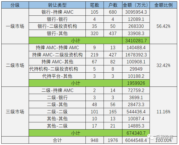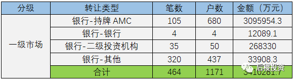 根據(jù)已有數(shù)據(jù)顯示,一級市場總成交戶數(shù)1171戶,總成交金額約341億余元,占全年市場交易量56%。其中成交規(guī)模最大的為銀行-持牌AMC,成交金額在一級市場中占90.8%,但比去年減少約60億元。