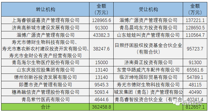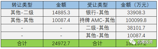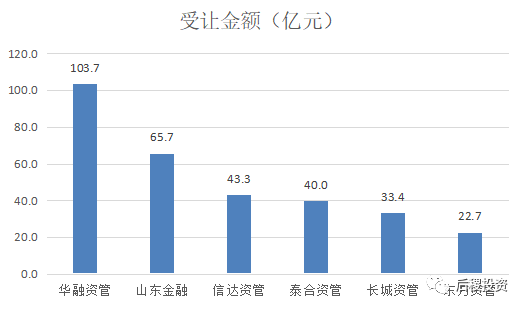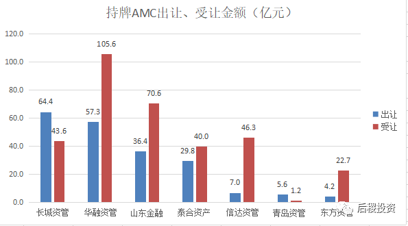 從出讓金額與受讓金額的對比中看,華融資管、山東金融、泰和資管、信達(dá)資管、東方資管受讓金額均大于出讓金額,則長城資管、青島資管受讓金額小于出讓金額。