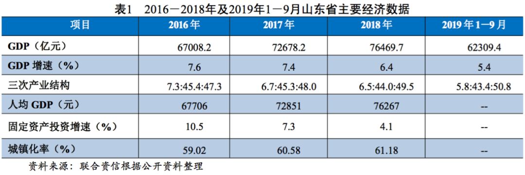 從經(jīng)濟運行方面看,山東省近三年經(jīng)濟保持穩(wěn)定增長,產(chǎn)業(yè)結(jié)構(gòu)更趨優(yōu)化,整體經(jīng)濟環(huán)境向好。2016-2018年,山東省分別實現(xiàn)地區(qū)生產(chǎn)總值67008.2億元、72678.2億元和76469.7億元,經(jīng)濟規(guī)模在全國處于上游水平;增速分別為7.6%、7.4%和6.4%,2018年增速低于全國平均水平,增速有所放緩;三次產(chǎn)業(yè)結(jié)構(gòu)由2016年的7.3:45.4:47.3調(diào)整為6.5:44.0:49.5,第三產(chǎn)業(yè)占比不斷增長,產(chǎn)業(yè)結(jié)構(gòu)更趨優(yōu)化。固定資產(chǎn)投資方面,2018年,山東省固定資產(chǎn)投資(不含農(nóng)戶)比上年增長4.1%,增速低于全國增速1.8個百分點,增速較2017年的7.3%有所放緩,三次產(chǎn)業(yè)投資構(gòu)成為1.7:39.5:58.8,服務(wù)業(yè)投資比重比上年提高10.3個百分點。全年房地產(chǎn)開發(fā)投資7553.0億元,比上年增長13.8%。2019年1-9月,山東省實現(xiàn)地區(qū)生產(chǎn)總值62309.4億元,按可比價計算,增長5.4%,仍低于全國平均增速;其中,三次產(chǎn)業(yè)結(jié)構(gòu)調(diào)整為5.8:43.4:50.8,服務(wù)業(yè)占比同比提高1.5個百分點。2019年前三季度山東省經(jīng)濟運行繼續(xù)保持平穩(wěn)發(fā)展勢頭。