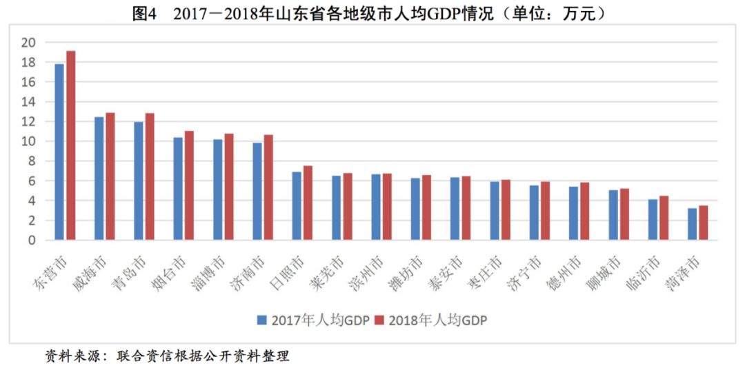 從山東省地級市GDP方面看,青島市的GDP規(guī)模和增速處于領(lǐng)先地位,2017-2018年,青島市GDP分別為11037.28億元和12001.50億元,GDP增速分別為7.5%和7.4%,2018年青島市GDP占全省的比重為15.69%。濟南市和煙臺市的GDP規(guī)模僅次于青島市,2018年,上述兩個地級市的GDP規(guī)模分別為7856.56億元和7232.58億元;濰坊市和淄博市的GDP規(guī)模均超過5000億元;GDP規(guī)模在5000~3000億元的地級市有濟寧市、臨沂市、東營市、泰安市、威海市、德州市、聊城市和菏澤市;日照市、濱州市、棗莊市和萊蕪市經(jīng)濟實力較弱,GDP均不到3000億元。總體看,山東省各地級市經(jīng)濟分化程度較高,青島市的GDP規(guī)模及增速處于絕對領(lǐng)先地位,濟南市、煙臺市、濰坊市和淄博市經(jīng)濟體量其次,濱州市、棗莊市、日照市和萊蕪市經(jīng)濟體量小。從人均GDP來看,2017年和2018年東營市、青島市和威海市的人均GDP處于省內(nèi)最高,而聊城市、臨沂市和菏澤市規(guī)模最小,人均GDP差異主要為地方經(jīng)濟實力及人口規(guī)模等因素所致。