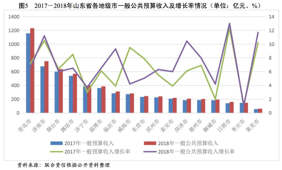 山東省經(jīng)濟規(guī)模處于全國上游水平,2018年GDP排名全國第三,一般公共預(yù)算收入排名全國前列,政府債務(wù)率處于全國偏低水平,整體債務(wù)負擔(dān)輕。山東省各地級市經(jīng)濟實力和財政收入分化較重,東部沿海城市和省會濟南市的經(jīng)濟規(guī)模和財政實力明顯高于其他地級市。山東省各地級市一般公共預(yù)算收入質(zhì)量較好,部分地級市政府債務(wù)負擔(dān)較重。