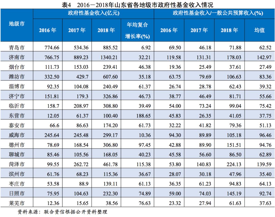 從政府性基金收入來看,山東省各地級市收入分化較重,其中濟南市的收入規(guī)模最大,2018年達1340.21億元,遠超其他地級市,其次為青島市和濰坊市,2018年分別為885.52億元和607.60億元,其余地級市政府性基金收入規(guī)模均在500億元以下,其中萊蕪市規(guī)模最小,2018年為38.56億元。從政府性基金收入增速來看,東營市和菏澤市的增速最大,近三年的年均復(fù)合增長率分別為188.65%和115.38%,青島市增速最小,近三年復(fù)合增長僅為6.92%。從政府性基金收入占一般公共預(yù)算收入的比重均值來看,濟南市和菏澤市占比均超過100%,且上述兩個地級市過往三年的政府性基金收入占當(dāng)年一般公共預(yù)算收入的比重持續(xù)增長,政府財力對基金預(yù)算收入的依賴性逐步增強;淄博市、萊蕪市、濱州市、東營市和煙臺市的比重均值較小,處于40%以下;其余大部分地級市的比重均值處于50%~95%之間。總體看,山東省部分地級市政府財政收入對政府性基金收入的依賴性較高,當(dāng)?shù)刎斦杖氲膶崿F(xiàn)性易受房地產(chǎn)市場景氣度以及土地出讓進度的影響。