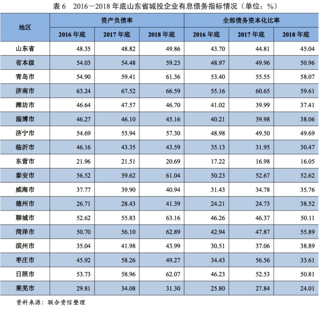 從債務(wù)指標(biāo)看,2016-2018年,山東省城投企業(yè)整體資產(chǎn)負債率和全部債務(wù)資本化比率均呈上升趨勢,山東省城投企業(yè)債務(wù)負擔(dān)持續(xù)增長。從山東省各地級市城投企業(yè)債務(wù)指標(biāo)看,2018年,青島市、濟南市、菏澤市、泰安市、聊城市和日照市城投企業(yè)資產(chǎn)負債率均超過60%,全部債務(wù)資本化比率均超過50%,上述地級市城投企業(yè)債務(wù)負擔(dān)較重。