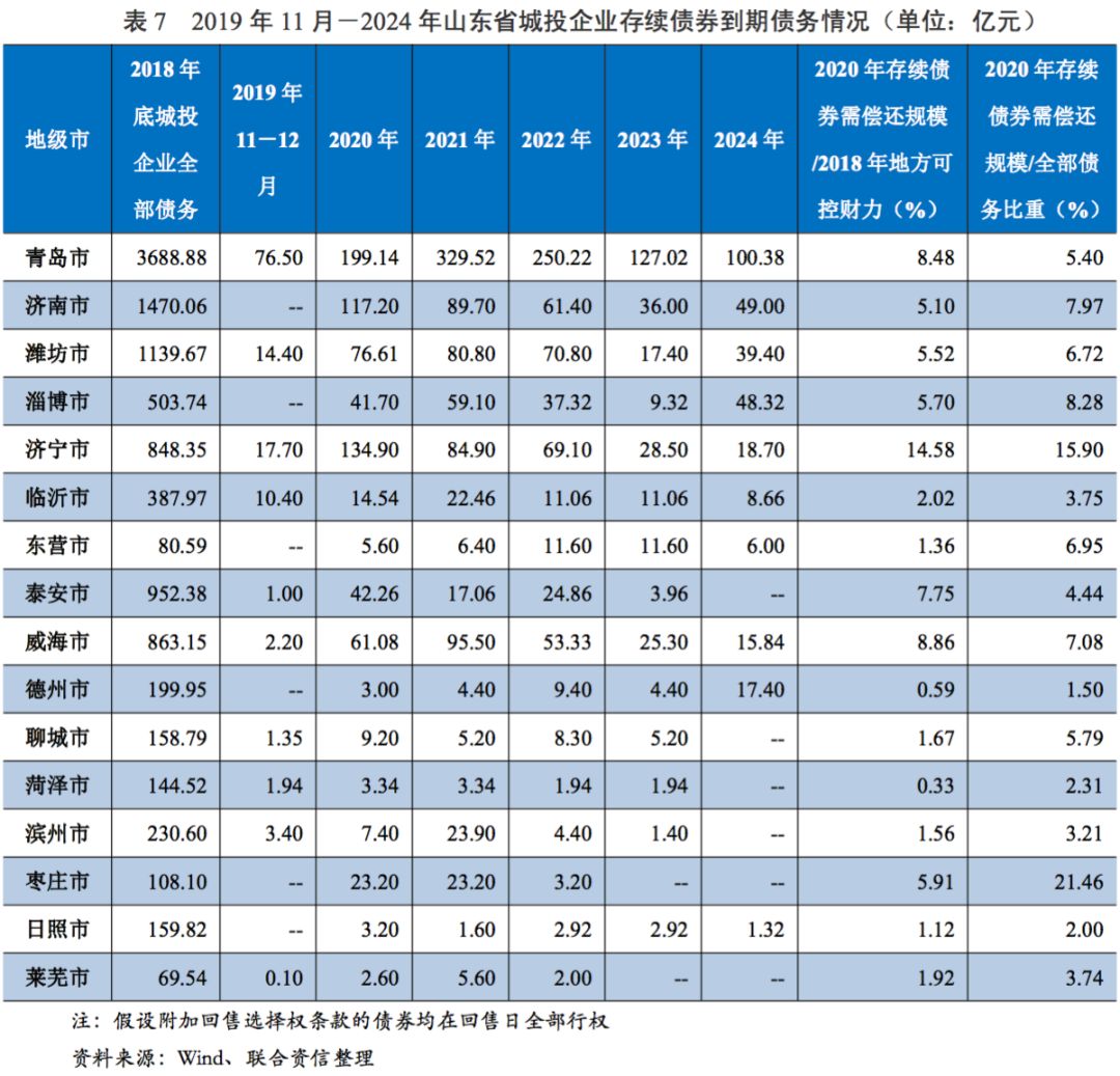 從各地級市城投企業(yè)存續(xù)債券未來五年(2020-2024年)需償還規(guī)模的分布看,假設(shè)附加回售選擇權(quán)條款的存續(xù)債券均于回售日全部行權(quán),山東省城投企業(yè)將于2020-2022年面臨債券到期高峰,其中濟寧市短期兌付壓力相對較高,2020年存續(xù)債券需償還規(guī)模/2018年地方可控財力的比例為14.58%,其次為威海市、青島市和泰安市,2020年存續(xù)債券需償還規(guī)模/2018年地方可控財力的比例分別為8.86%、8.48%和7.75%。考慮到山東省城投企業(yè)存續(xù)債券將于2020-2022年面臨集中兌付高峰期,部分地級市城投企業(yè)的融資壓力將增大,山東省城投企業(yè)未來融資狀況和融資成本變化需密切關(guān)注。