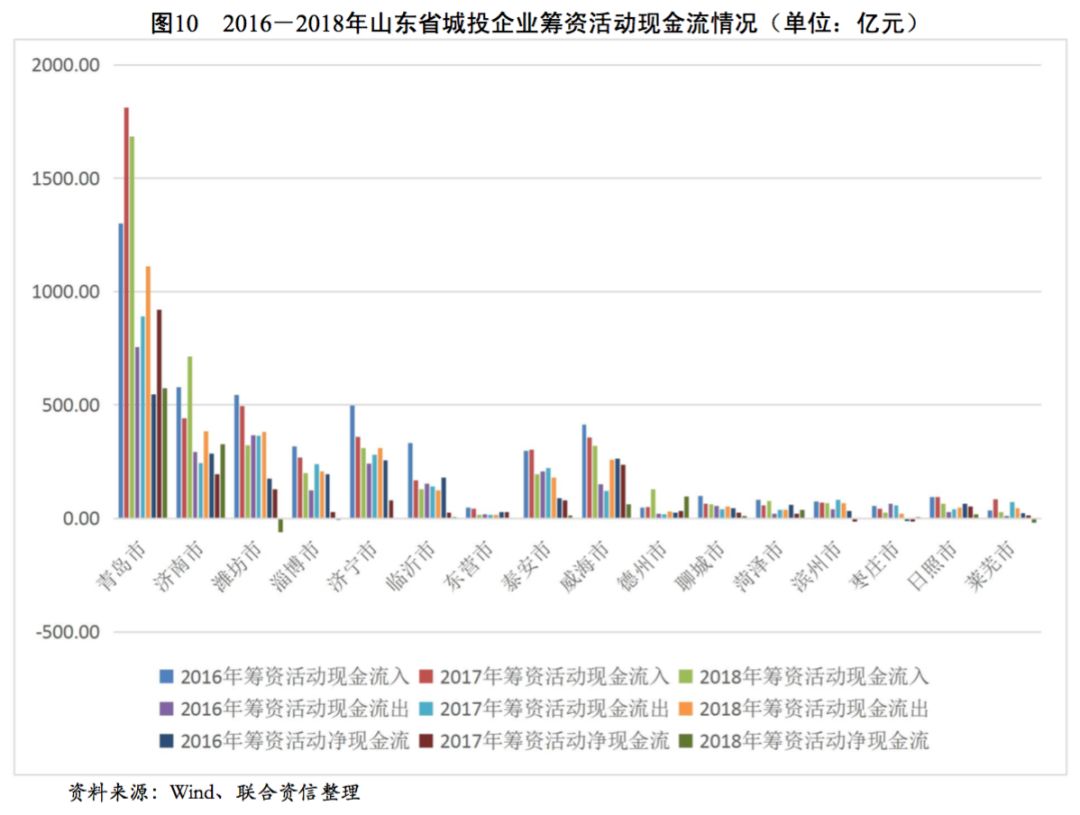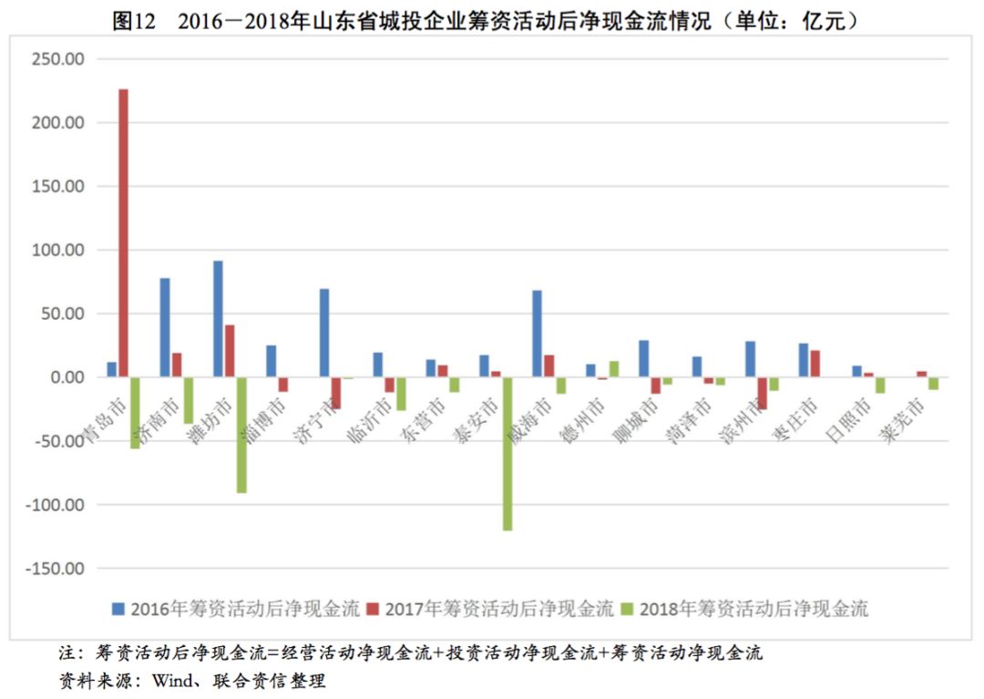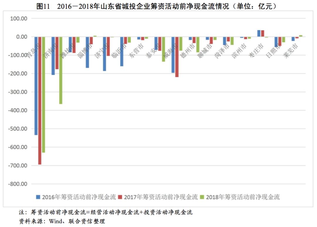 從各地級市城投企業(yè)籌資活動現(xiàn)金流狀況看,2016-2018年,青島市、濟南市和德州市城投企業(yè)籌資活動現(xiàn)金流入波動上升,年均復(fù)合增長率分別為13.80%、11.08%和65.37%,其余地級市城投企業(yè)籌資活動現(xiàn)金流入均呈波動下降趨勢,山東省大部分地級市城投企業(yè)籌資力度有所下降。反觀籌資活動現(xiàn)金流出情況,近三年除臨沂市、東營市、泰安市和棗莊市城投企業(yè)籌資活動現(xiàn)金流出有不同程度下降外,其余地級市城投企業(yè)籌資活動現(xiàn)金流出均有所增長。受流入減少、流出增多趨勢的共同影響,山東省大部分地級市城投企業(yè)籌資活動凈現(xiàn)金流均大幅下降,但經(jīng)濟實力較強的青島市和濟南市仍保有較大規(guī)模的籌資活動現(xiàn)金凈流入。從籌資活動前凈現(xiàn)金流看,2018年除淄博市和萊蕪市為凈流入以外,山東省其余各地級市均為凈流出態(tài)勢,其中青島市、濟南市和泰安市資金缺口最大。從籌資活動后凈現(xiàn)金流來看,2016-2018年,山東省地級市城投企業(yè)籌資活動后凈現(xiàn)金流整體呈下降趨勢,其中青島市、濟南市、濰坊市、泰安市和臨沂市在2018年降幅明顯,上述地級市的城投企業(yè)融資壓力明顯加大。