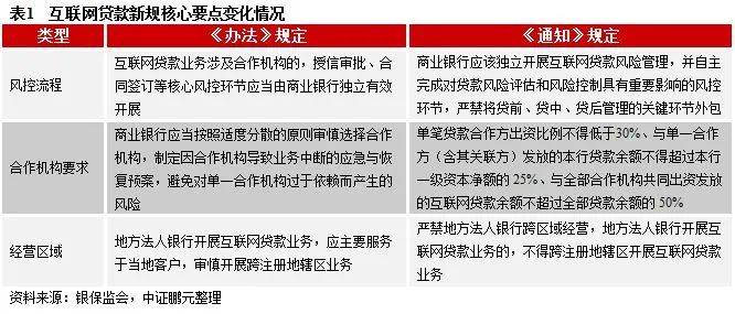 《通知》主要從以下四個方面對商業(yè)銀行互聯(lián)網(wǎng)貸款業(yè)務(wù)進(jìn)行了規(guī)定:首先是明確銀行風(fēng)控流程的獨立性,要求商業(yè)銀行應(yīng)該獨立開展互聯(lián)網(wǎng)貸款風(fēng)險管理,并自主完成對貸款風(fēng)險評估和風(fēng)險控制具有重要影響的風(fēng)控環(huán)節(jié),嚴(yán)禁將貸前、貸中、貸后管理的關(guān)鍵環(huán)節(jié)外包,相較于《辦法》中提出的“互聯(lián)網(wǎng)貸款業(yè)務(wù)涉及合作機構(gòu)的,授信審批、合同簽訂等核心風(fēng)控環(huán)節(jié)應(yīng)當(dāng)由商業(yè)銀行獨立有效開展”更為嚴(yán)苛。其次是明確規(guī)定了3項定量管理要求,即:單筆互聯(lián)網(wǎng)聯(lián)合貸款中合作方出資比例不得低于30%、與單一合作方(含其關(guān)聯(lián)方)發(fā)放的本行貸款余額不得超過本行一級資本凈額的25%、同全部合作機構(gòu)共同出資發(fā)放的互聯(lián)網(wǎng)貸款余額不超過全部貸款余額的50%,相較于《辦法》提出了更為具體的量化監(jiān)管指標(biāo)約束。然后是嚴(yán)禁地方法人銀行跨區(qū)域經(jīng)營,地方法人銀行開展互聯(lián)網(wǎng)貸款業(yè)務(wù)的,不得跨注冊地轄區(qū)開展互聯(lián)網(wǎng)貸款業(yè)務(wù),這相較于《辦法》中的“地方法人銀行開展互聯(lián)網(wǎng)貸款業(yè)務(wù),應(yīng)主要服務(wù)于當(dāng)?shù)乜蛻簦瑢徤鏖_展跨注冊地轄區(qū)業(yè)務(wù)”有了更為嚴(yán)格的監(jiān)管意見。最后是設(shè)定了過渡期安排,對于出資比例標(biāo)準(zhǔn)和跨區(qū)域經(jīng)營的限制,實行“新老劃斷”,要求從2022年1月1日起的新發(fā)生業(yè)務(wù)依照新出資比例和區(qū)域要求執(zhí)行,對于存量業(yè)務(wù)自然結(jié)清;集中度風(fēng)險管理、貸款總額限額管理的量化標(biāo)準(zhǔn)則要求在2022年7月17日前有序整改完畢,總體與《辦法》的過渡期銜接基本一致。