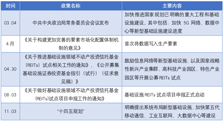 關(guān)于基礎(chǔ)設(shè)施和數(shù)據(jù)中心的主要政策(2020年發(fā)布)