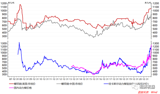 疫情。疫情對供給的沖擊體現在多個方面,一方面,由于供應鏈的破壞,導致海外大宗商品漲幅比國內更大,加劇了抑制大宗商品價格工作的難度,因為一旦國內打壓的厲害,企業就會通過出口進行“套利”(圖8)。比如美國螺紋鋼價格超過了國內,而且價差有擴大趨勢;再比如,紐卡斯爾動力煤價格超過180美元/噸,合人民幣突破1200元一噸。另一方面,由于人流、物流和貨船