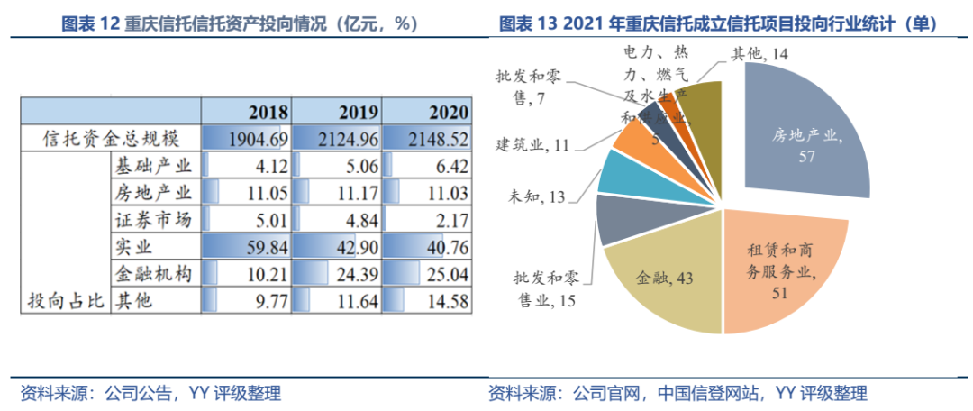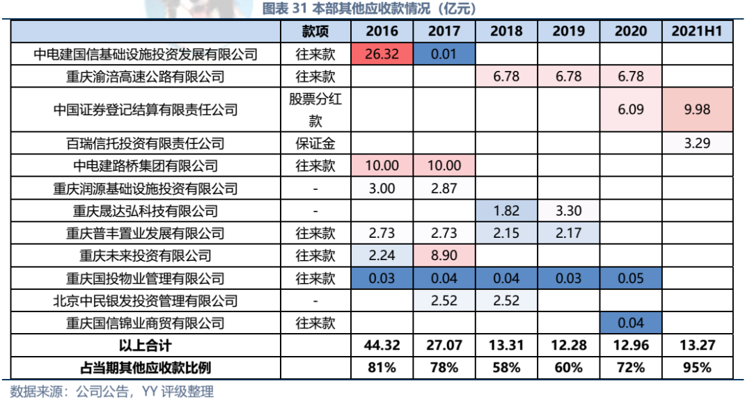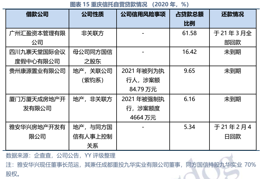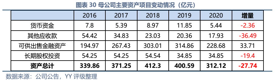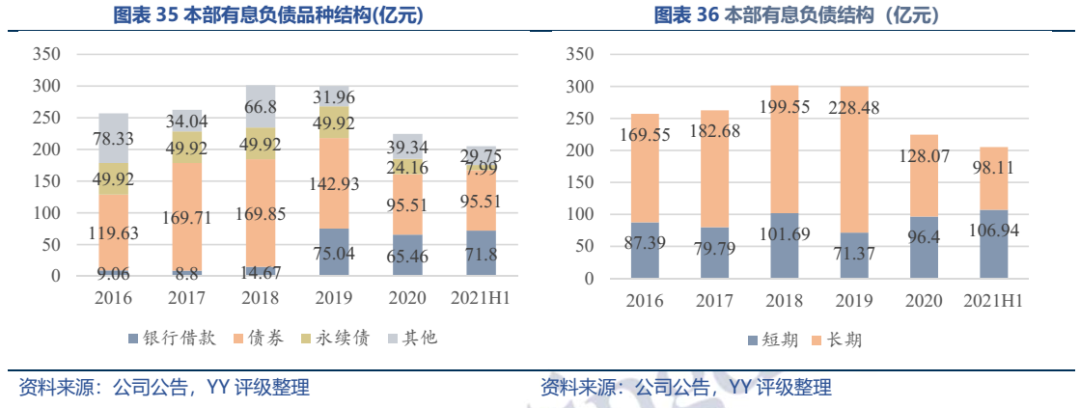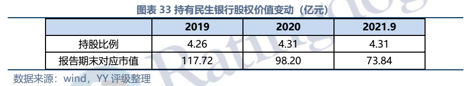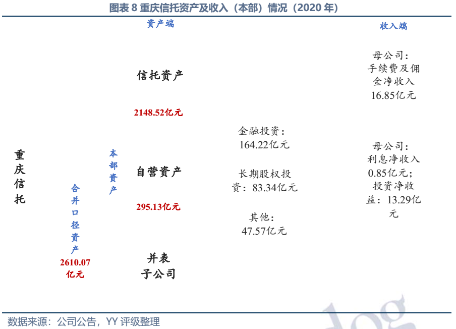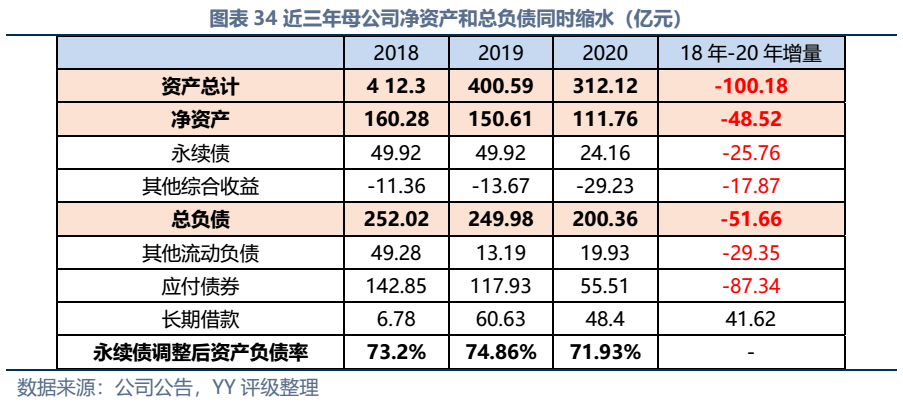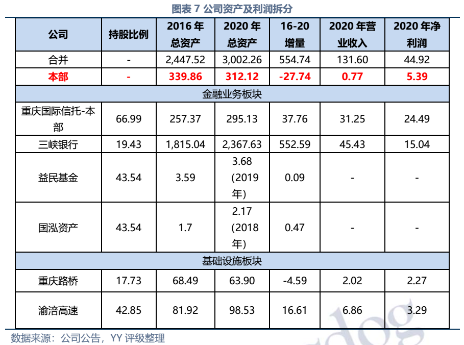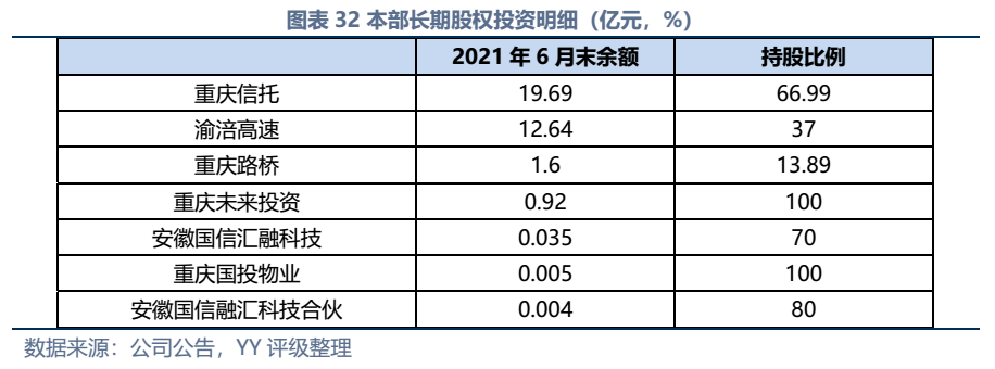 因同方國信子公司獨立性較強,我們主要梳理了本部的資產以及測算了債務壓力和短償債能力。資產方面,以信托投資(交易性金融資產103億元主要為信托投資)、民生銀行股票(最新市值約73億元,已質押,2019年來市值縮水37%)、重慶信托67%股權(賬面以成本法計量僅20億元,但按重慶信托最新凈資產計量則價值282億元)為主;債務方面,19年以來,本部有息債務水平有所降低(主要通過可供出售金融資產變現償還),截至21年中,有息債務205億元,短債107億元,22年將有64億元債券到期或行權,短債壓力較大。測算短期可變現資源,預計短期內變現能力比較確定的僅約22億元,要覆蓋22年內到期或行權的64億元債券還有較大缺口,可能需要關注信托投資資產或者牌照的價值(比較難及,且由于重慶信托股權不可質押,且前文所描述,重慶信托的真實控制權在新渝富的持股鏈條上,同方國信更多是居于財務投資這一角色,可能如果臨時出現兌付危機,假設重慶信托的資產質量仍有支持,股權仍有較高價值)。