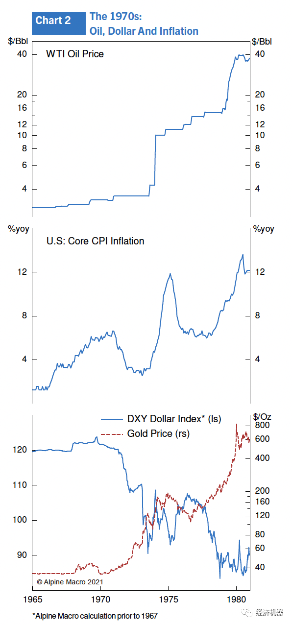 Alpine Macro在很多研究報告中呼吁這種擔(dān)憂過分了。我們一起看看20世紀(jì)70年代的通脹經(jīng)歷,當(dāng)年所發(fā)生的事情無疑是《華爾街日報》提到的“大時代轉(zhuǎn)折點(diǎn)”。我相當(dāng)清楚地記得那一幕,1960年代我曾在加拿大銀行工作,當(dāng)時的情況為1970年代的大通脹打下了基礎(chǔ)。