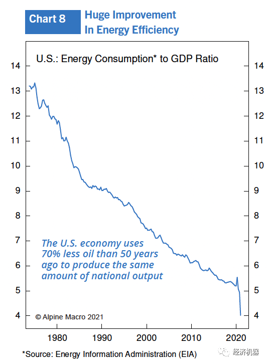 隨著美國經(jīng)濟(jì)石油需求密集度的急劇下降(圖8),不可能出現(xiàn)上世紀(jì)70年代那樣的重大石油沖擊。如果非要說有什么影響的話,隨著經(jīng)濟(jì)的脫碳進(jìn)程和科技不斷降低綠色替能源的成本,油價可能會承受更大的通縮壓力。任何綠色能源的狂熱都意味著該行業(yè)獲得資本的途徑似乎是無限的,這業(yè)必將增加替代能源的供應(yīng)。