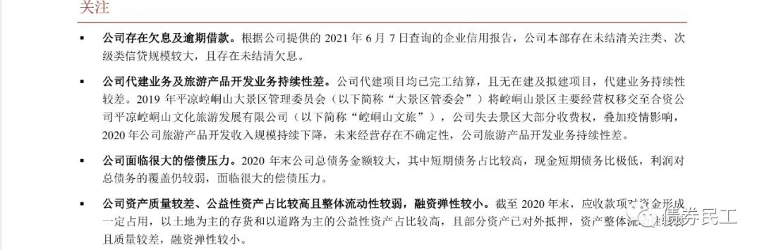 4、平涼文化旅游產業投資集團有限責任公司(以下簡稱“平涼旅投”)。根據中證鵬元6月29日出具的跟蹤評級報告,平涼旅投本部存在未結清關注類、次級類信貸規模較大,且存在未結清欠息。平涼旅投的控股股東為平涼市國資委,最新主體評級為A+,評級展望為穩定,目前存續債券1只,分別為“15平崆旅債”(企業債券,債券余額為1.4億元),由瀚華融資擔保股份有限公司提供擔保。