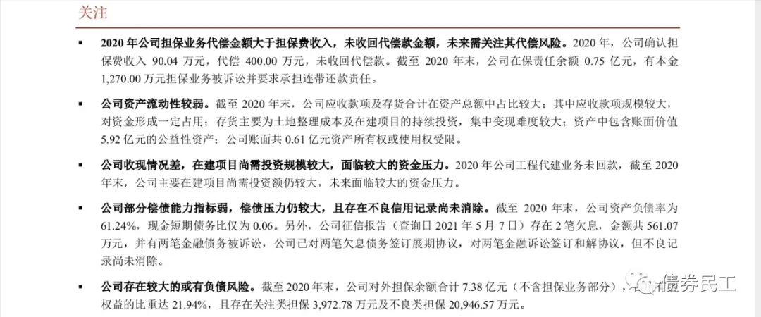 3、遵義市播州區城市建設投資經營(集團)有限公司(以下簡稱“播州建投”)。根據中誠信國際2021年6月29日出具的跟蹤評級報告,播州建投存在多筆關注類、不良貸款、欠息、被追償等不良記錄,且已經被納入失信被執行人名單。播州建投的控股股東為遵義道橋建設(集團)有限公司,播州建投最新主體評級為AA-,評級展望為負面,目前存續債券2只,分別為“17遵義播投債01”(企業債券,債券余額為6.4億元)、“PR播投02”(企業債券,債券余額為5.6億元)。